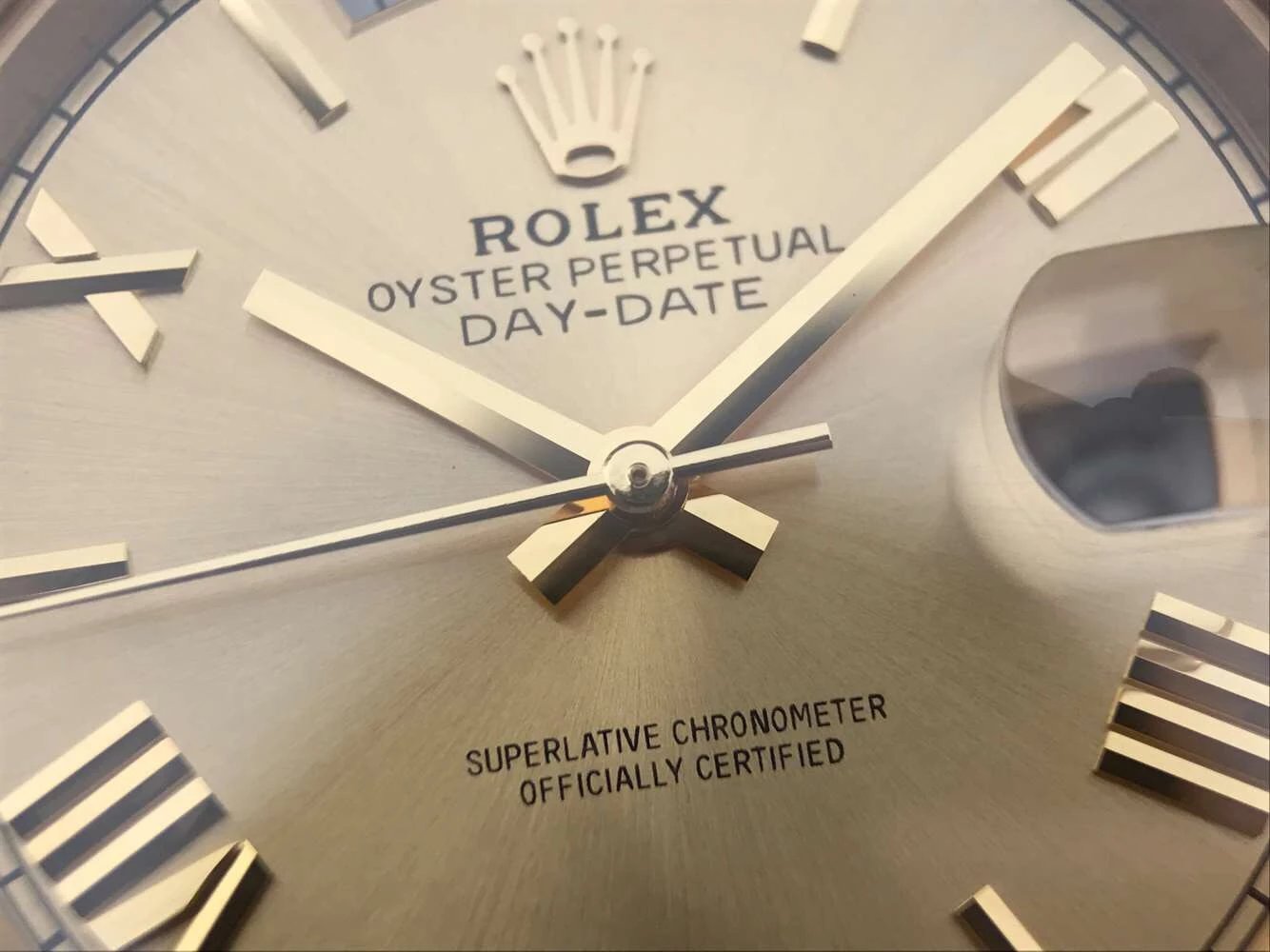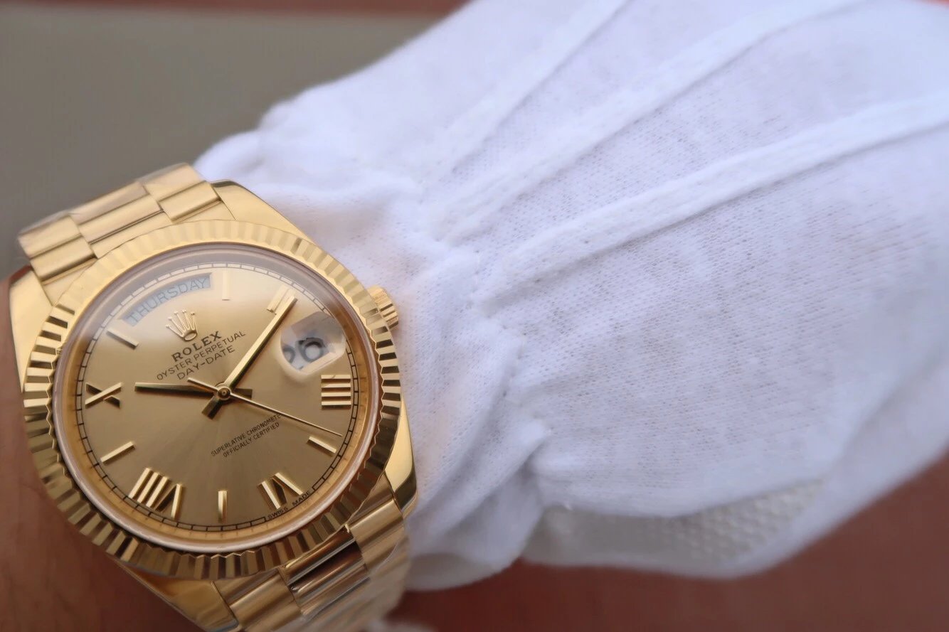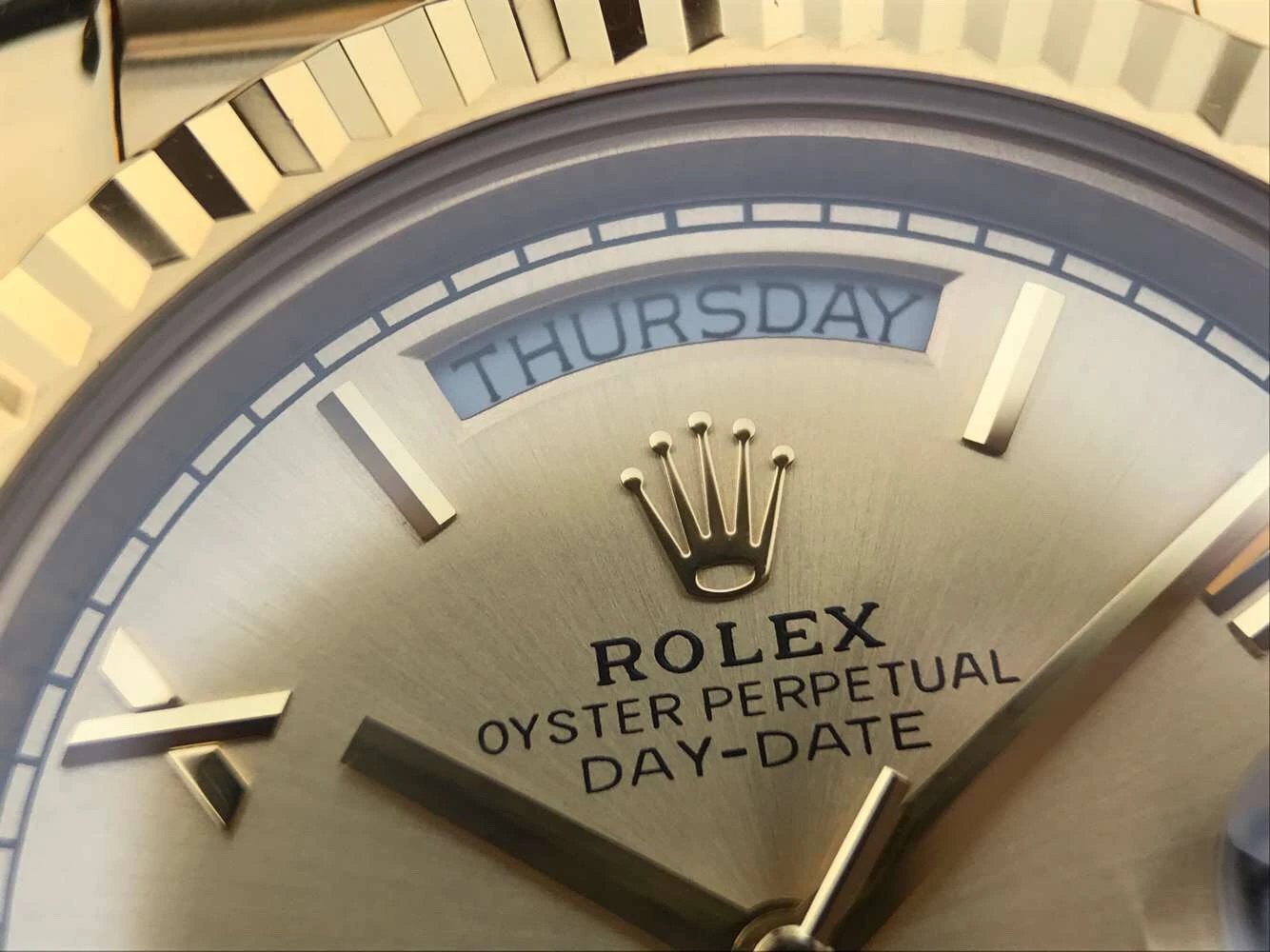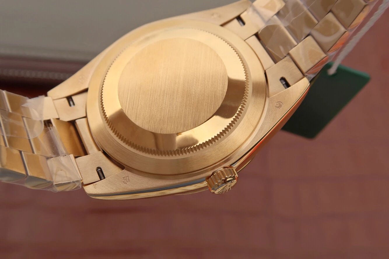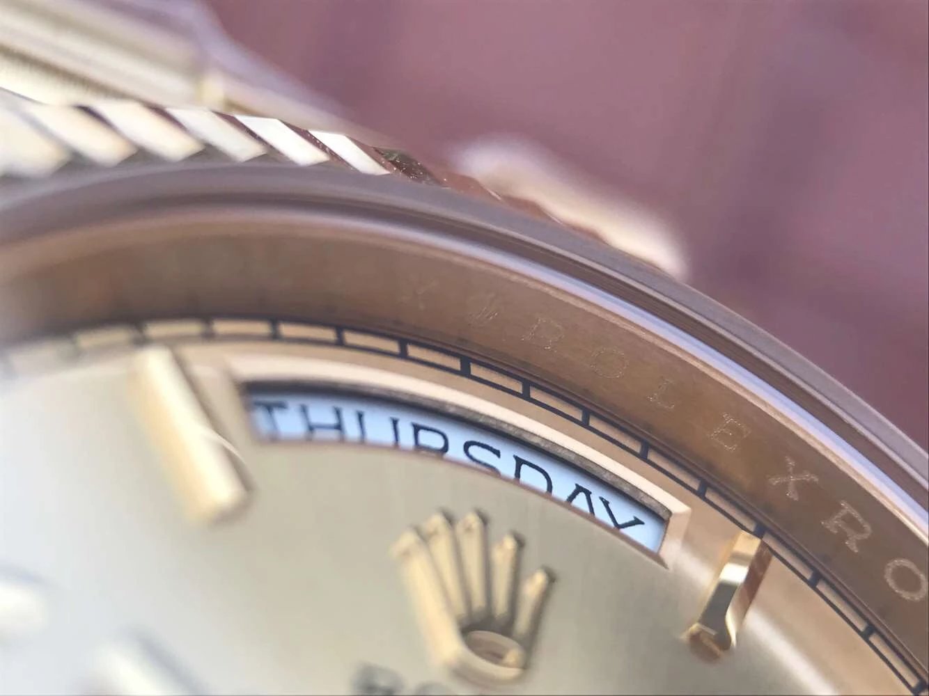 The Rolex Day-Date (40mm) M228238-0006 watch underwent a year and a half of research and development, with a 1:1 mold based on the original version. Key upgrade highlights include: maintaining a 40mm case diameter consistent with the latest 2016 edition 3255 series; the bracelet end links match the original, comprising 5 assembled parts with extremely high difficulty, seamlessly interlocking with the case; the two dots below the crown are restored to the original design. The clasp features an added spring, maintaining consistency in font size craftsmanship with the original. The side of the case is equipped with a QR code anti-counterfeiting feature, while the case back has a QR code for authentication. The connection point is engraved with the model number 228239. The inner ring is engraved with a serial number consistent with the warranty card, achieving a unique one-watch-one-card-one-code authenticity. It comes with a complete set of original packaging, including warranty card, instructions, and model barcode, perfectly matching the packaging of the original, making it a true one-to-one replica of the Day-Date model available on the market.