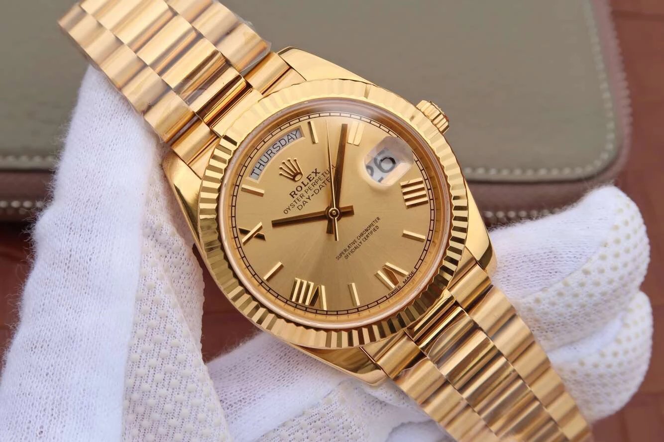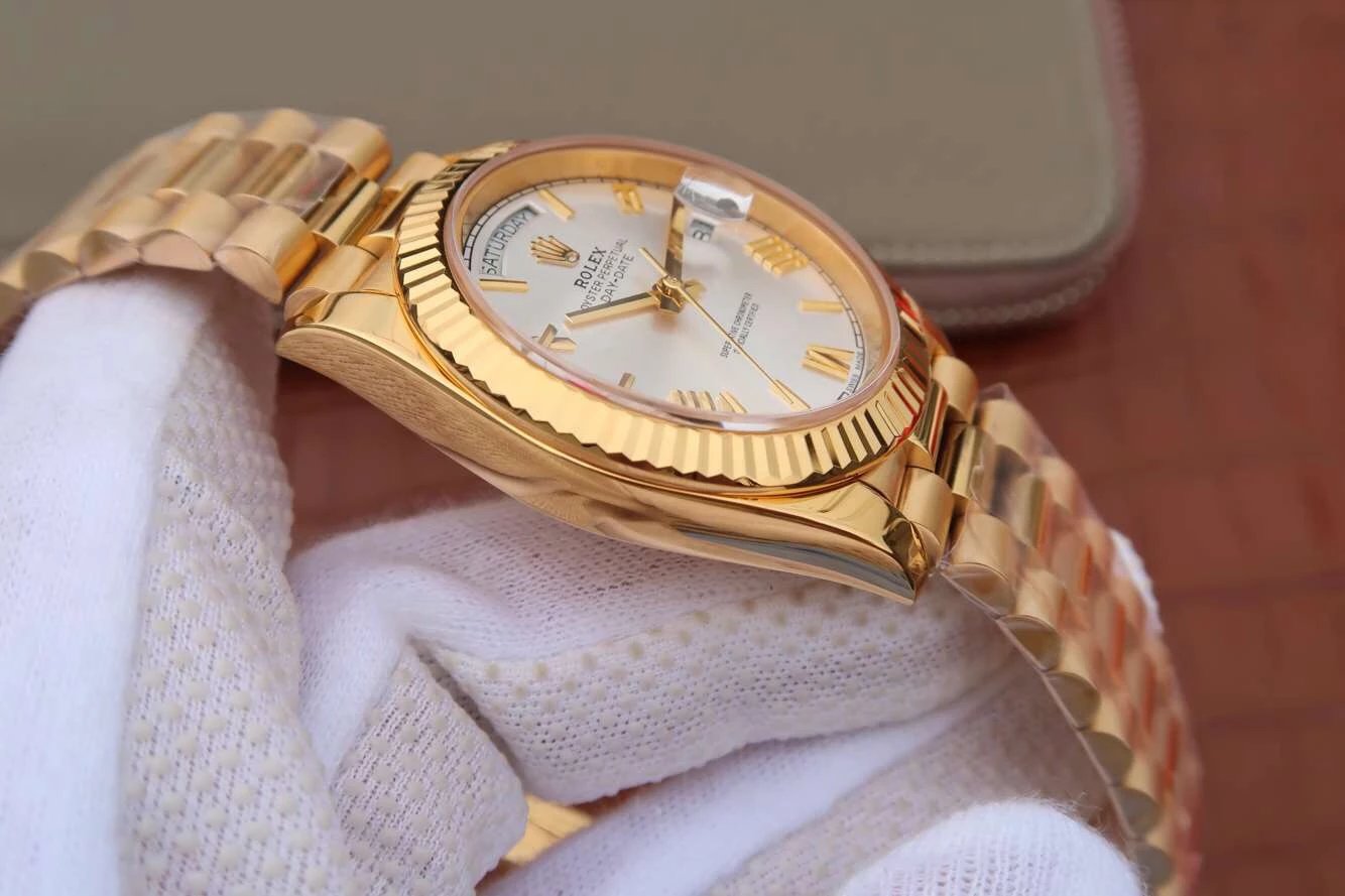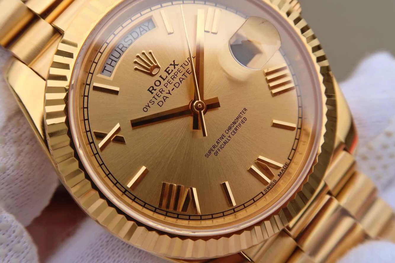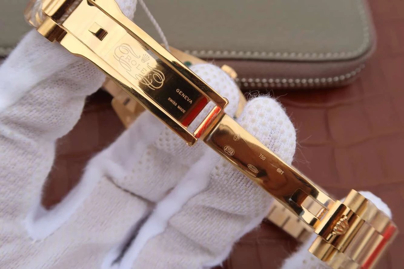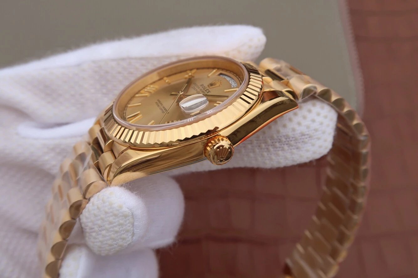 The Rolex Day-Date (40mm) M228238-0006 watch underwent a year and a half of research and development, with a 1:1 mold based on the original version. Key upgrade highlights include: maintaining a 40mm case diameter consistent with the latest 2016 edition 3255 series; the bracelet end links match the original, comprising 5 assembled parts with extremely high difficulty, seamlessly interlocking with the case; the two dots below the crown are restored to the original design. The clasp features an added spring, maintaining consistency in font size craftsmanship with the original. The side of the case is equipped with a QR code anti-counterfeiting feature, while the case back has a QR code for authentication. The connection point is engraved with the model number 228239. The inner ring is engraved with a serial number consistent with the warranty card, achieving a unique one-watch-one-card-one-code authenticity. It comes with a complete set of original packaging, including warranty card, instructions, and model barcode, perfectly matching the packaging of the original, making it a true one-to-one replica of the Day-Date model available on the market.